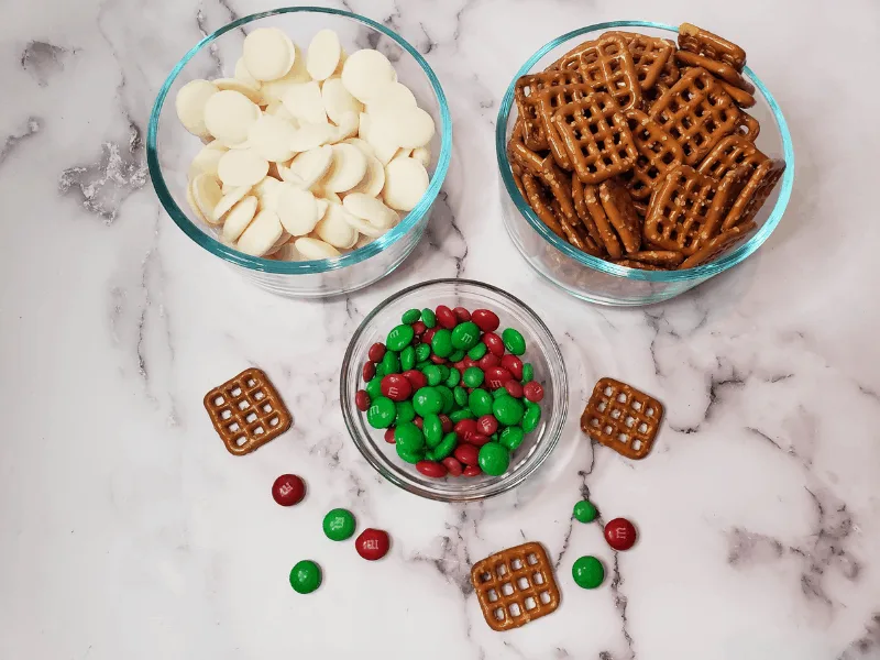 Gather Ingredients. I find this recipe easiest if all my ingredients are put into bowls so I am not having to reach into a bag, especially with the M&Ms. If you have a young one learning their colors you can take it a step further and let them separate the red and green candy-coated chocolates.