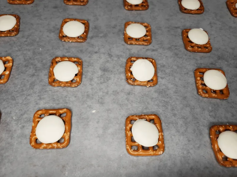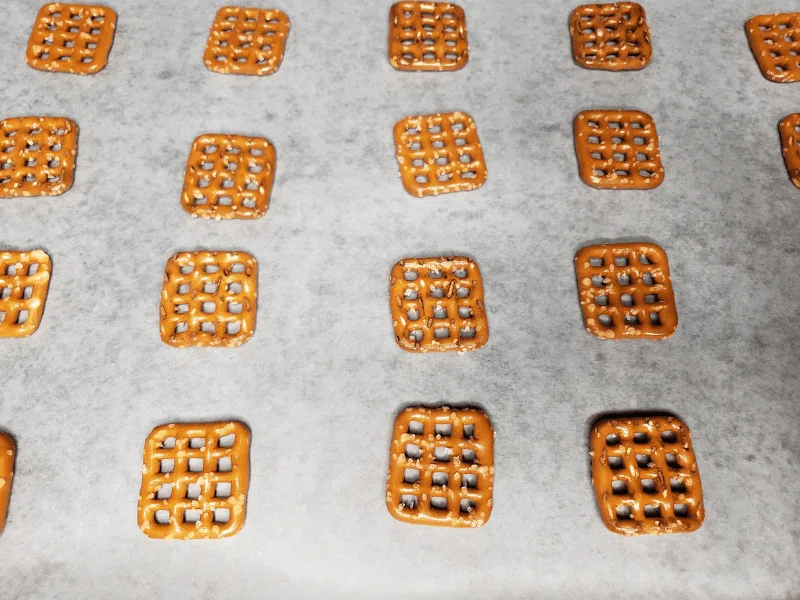 - Place the pretzels onto the cookie sheet in rows
