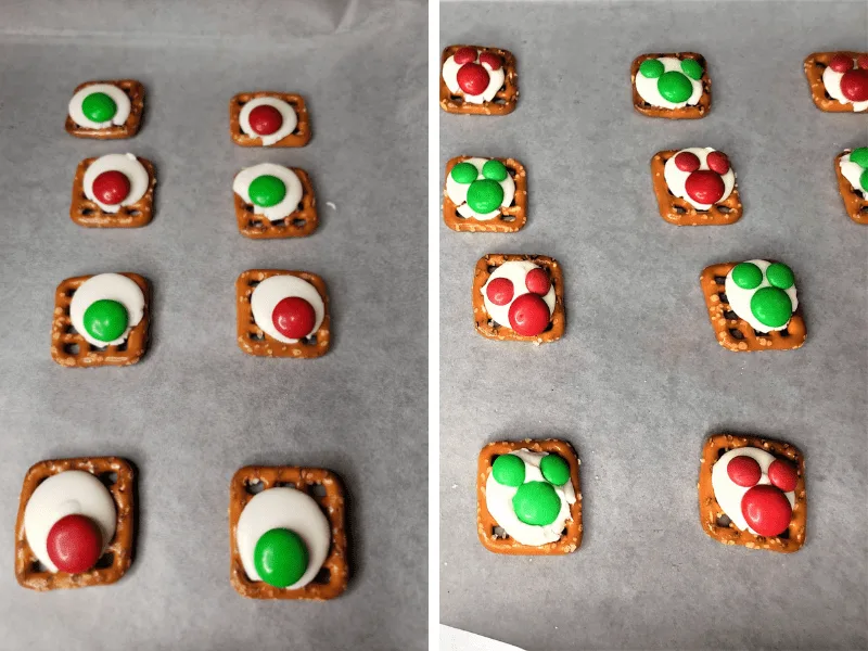 Pull the cookie sheet out of the oven and immediately place a regular M&M onto the candy melt (Place M side down). Add two mini M&Ms to act as the ears above the regular size M&M.