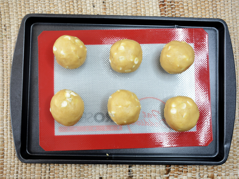 - Use a large ice scoop and scoop out 8 even cookie dough balls. Roll the dough balls in your hands to form a ball.