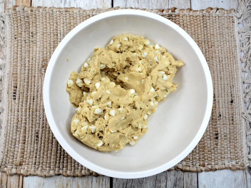 - Remove the bowl from the stand mixer and add the white chocolate chips. Using your hands, mix the baking chips into the dough.