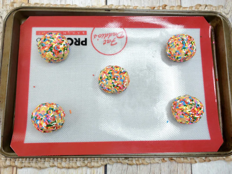 - Place a dough ball into the sprinkles and push the sprinkles into the ball covering it entirely.
