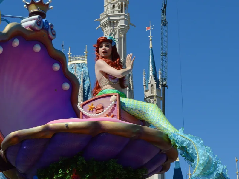 Catch Ariel in the Festival of Fantasy Parade. The Little Mermaid float is one of my favorites from the Festival of Fantasy Parade. It is so elaborate and fun! Ariel and her pals perch on a vibrant, kinetic seashell music box, creating a delightful musical celebration. The Under the Sea float is full of whimsy, with conga-dancing fish showing off their moves and bubbles floating everywhere. The performers, dressed as Lion Fish, Coral Fish, Seashells, and Sea Horses, wear shimmering fabrics and intricately designed costumes that look straight off the runway.