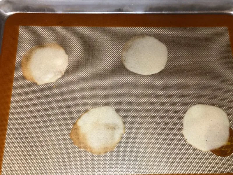 *Tip: Run the baking sheet under cold water and dry (or use a second baking sheet if you have it) between batches, as spreading the batter onto a warm sheet will cause the batter to cook incorrectly.