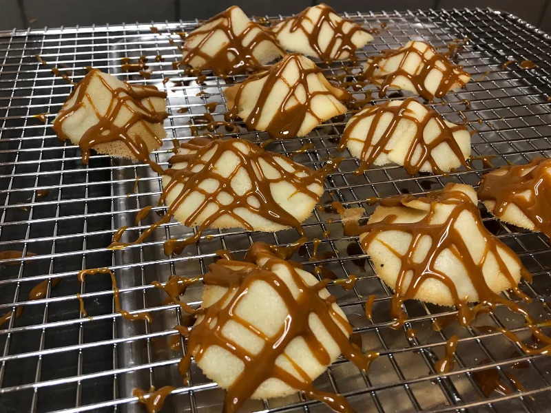 - Once all the cookies are baked and shaped, place the wire rack over a baking sheet, foil, or wax paper to help with cleanup. Drizzle with caramel syrup, first making horizontal strokes, then going back in a perpendicular direction to mimic the woven fibers in Raya’s hat.