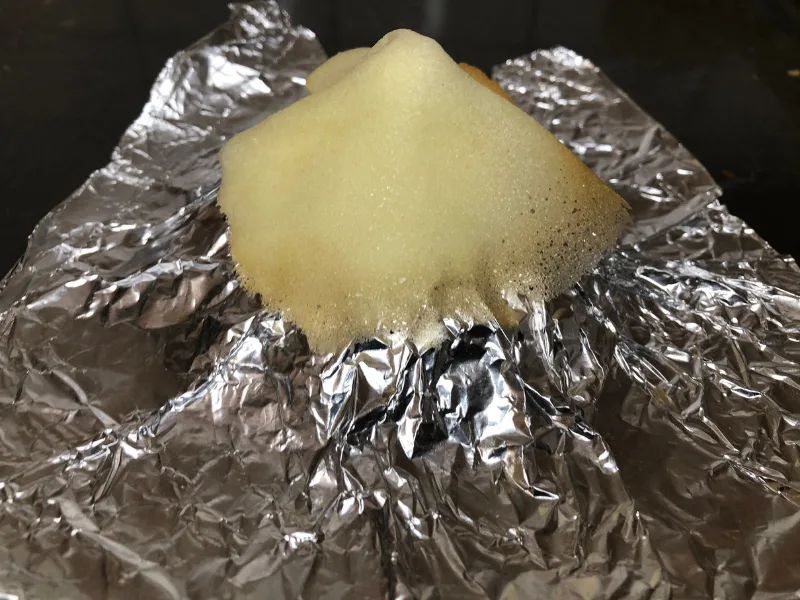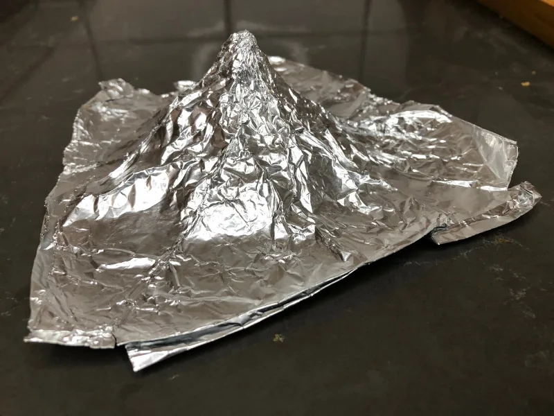 - While the batter is chilling, work on making your hat form. This is what you will drape the cookies over later in order to give them a conical shape. Use aluminum foil to make a volcano-shaped mound. Continue adding foil, shaping as you go, until you have a form that is about 2” tall and about 3” in diameter. Don’t worry if it isn’t perfect! The idea is just to give your cookies a pointy tip with a flared-out brim.
