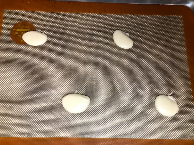 - Line a baking sheet with parchment paper or a Silpat. Drop 2 teaspoons of batter in an evenly spaced manner on the baking sheet. We recommend that you only bake about 4 cookies at a time, as they must be shaped on the form immediately after removal from the oven.