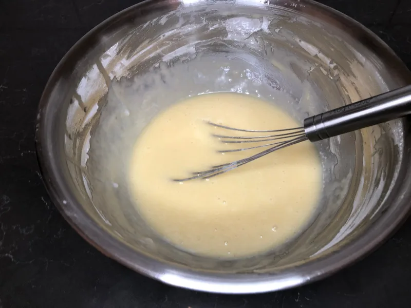 - Add the wet mixture into the dry mixture, whisking until all ingredients are combined and you have a thin and smooth batter.